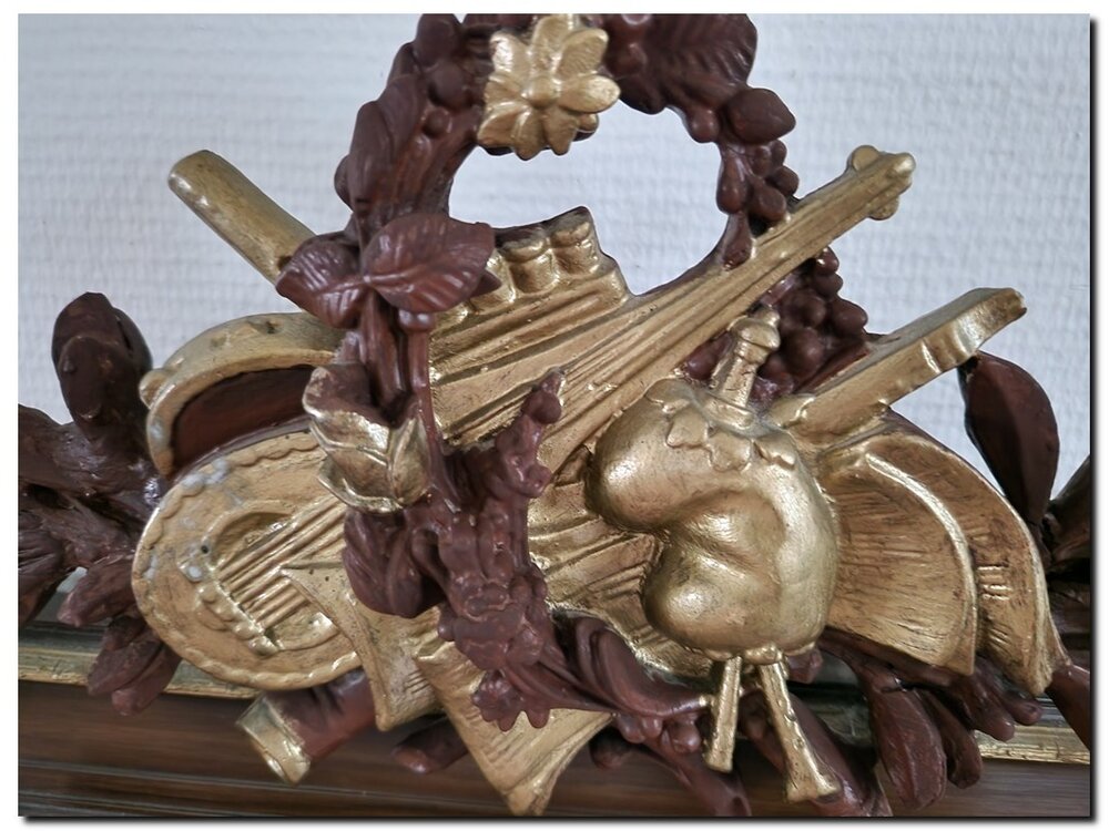 Dieser Wappenspiegel im Jugendstil zeichnet sich durch seine eleganten, organischen Formen und seine raffinierte Handwerkskunst aus. Er ist mit Musikinstrumenten (Winterhorn, Mandoline, Akkordeon und Banjo) sowie mit Naturmotiven wie Blumen und Blättern verziert.
