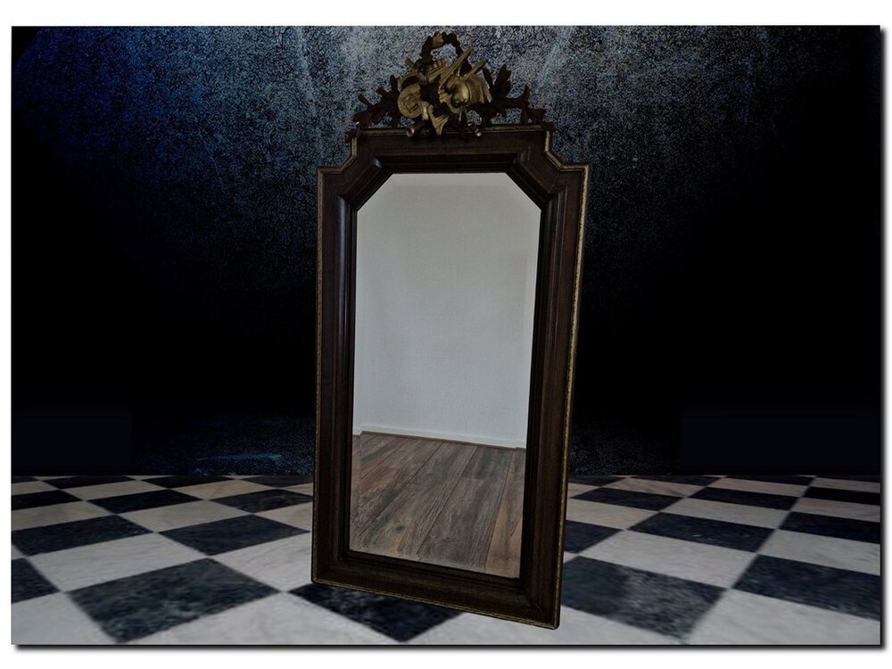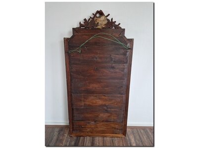 This mirror features original mirror glass surrounded by a wide faceted edge. The wooden frame is made of oak and has a rich, dark oak colour. Both the frame and the crest feature gold accents. The