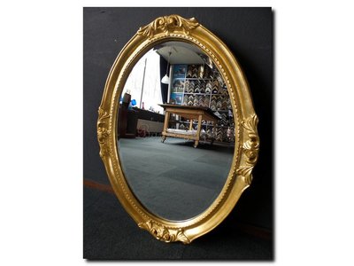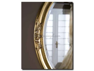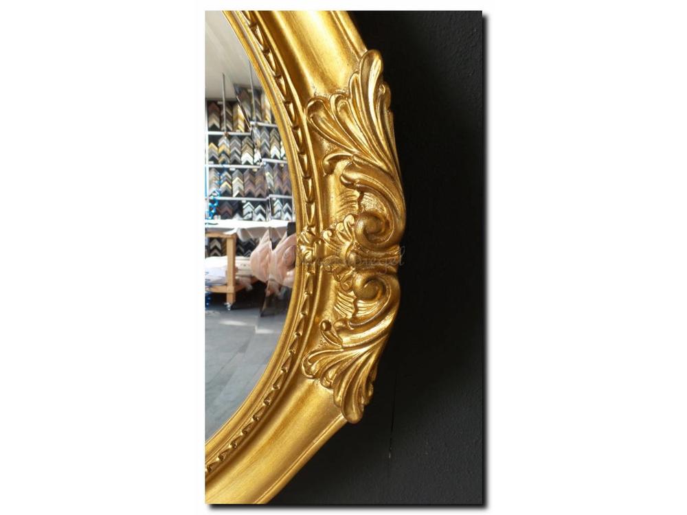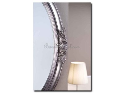 A beautiful classical oval mirror with ornaments of a leaf pattern that is shaped like a French Lily, gracefully crossing the frame.