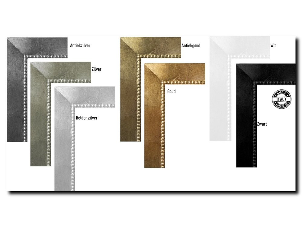 The frame is made of wood and the colouring is done with gold leaf or silver hammer metal.