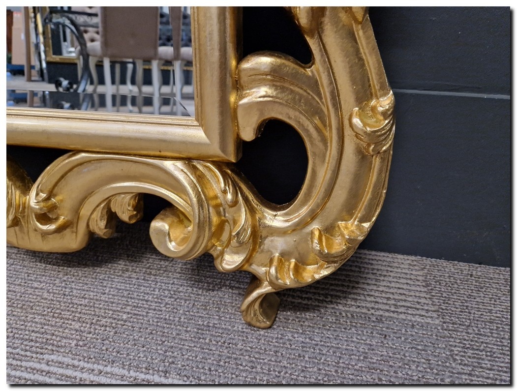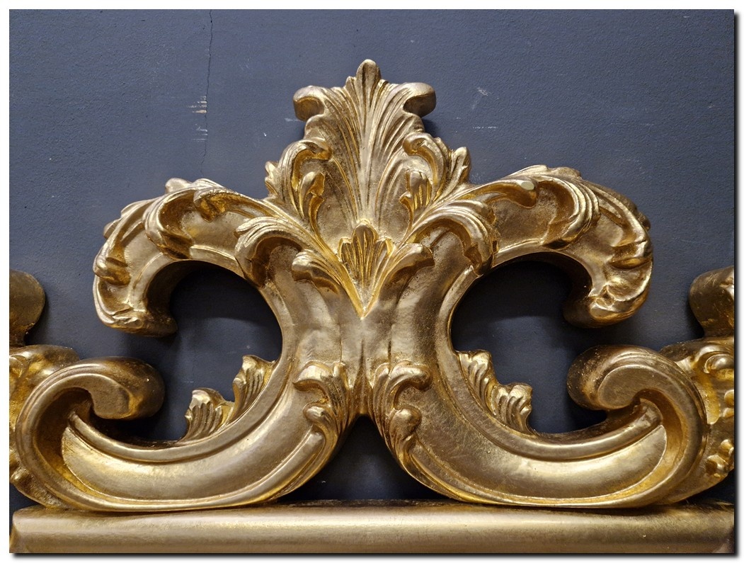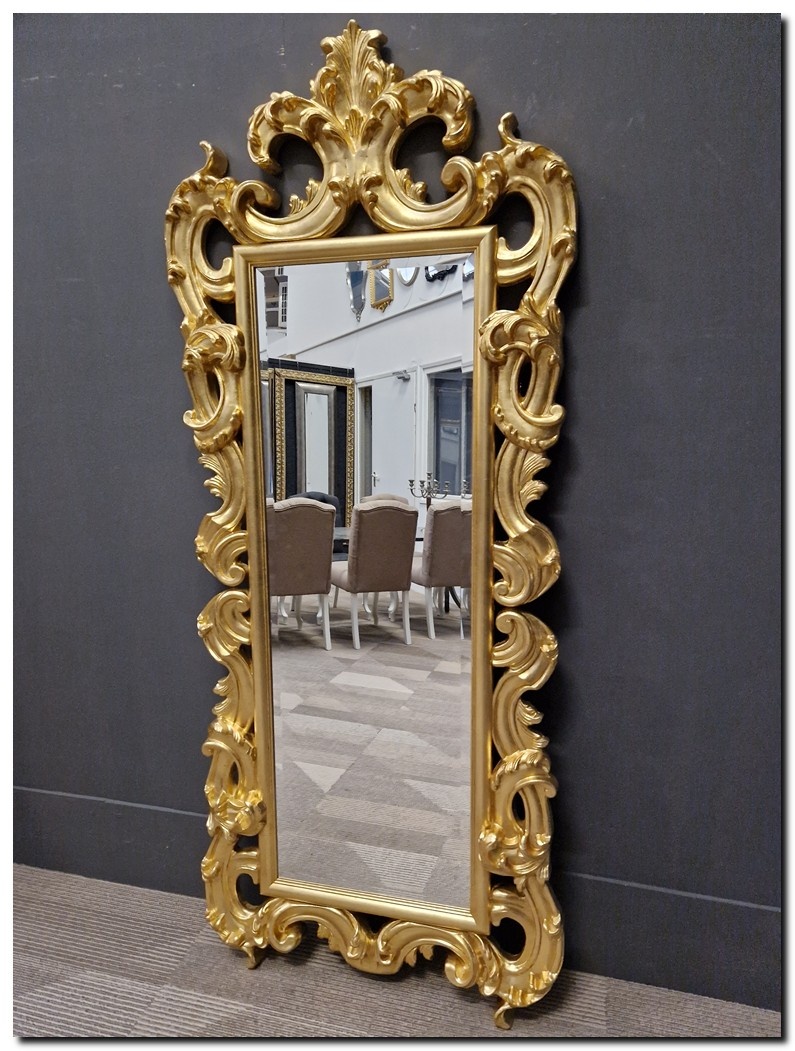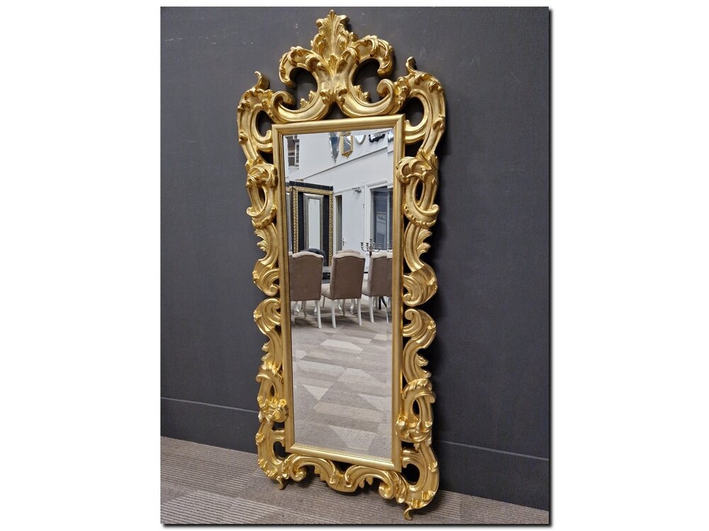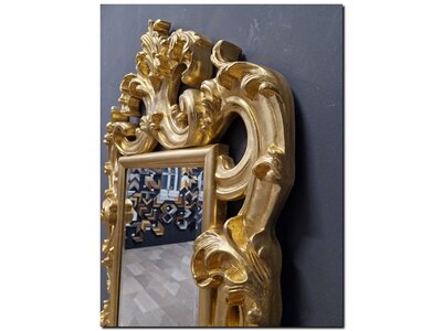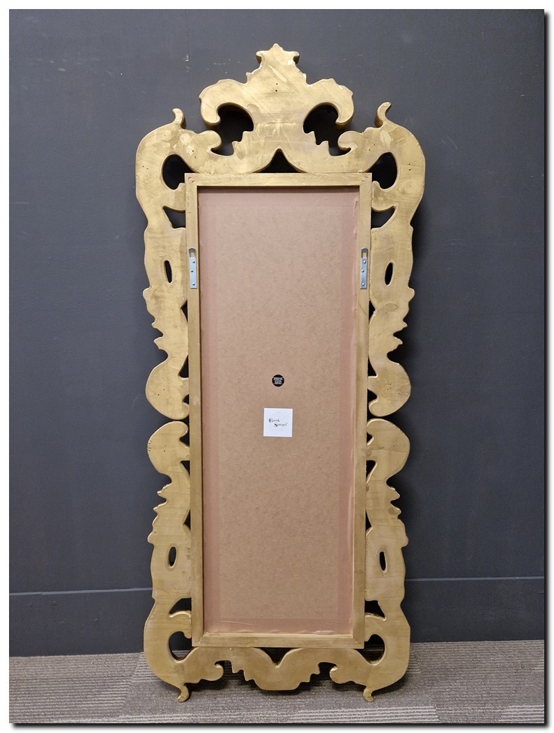 De uitbundige houten spiegel lijst staat op twee sierlijke pootjes waardoor de spiegel op de grond geplaatst kan worden met twee beugels aan de muur.
