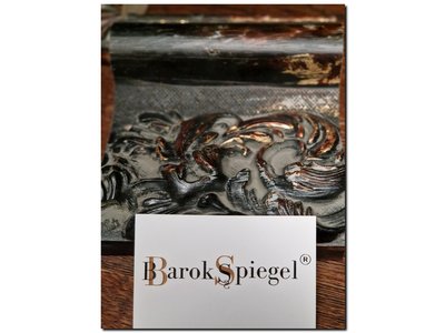 Deze spiegel heeft een massief houten lijst van 16 cm breed, bekroond door een prachtig ornament.