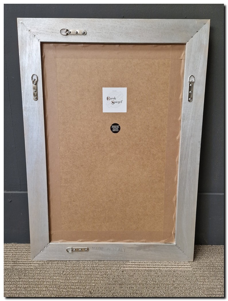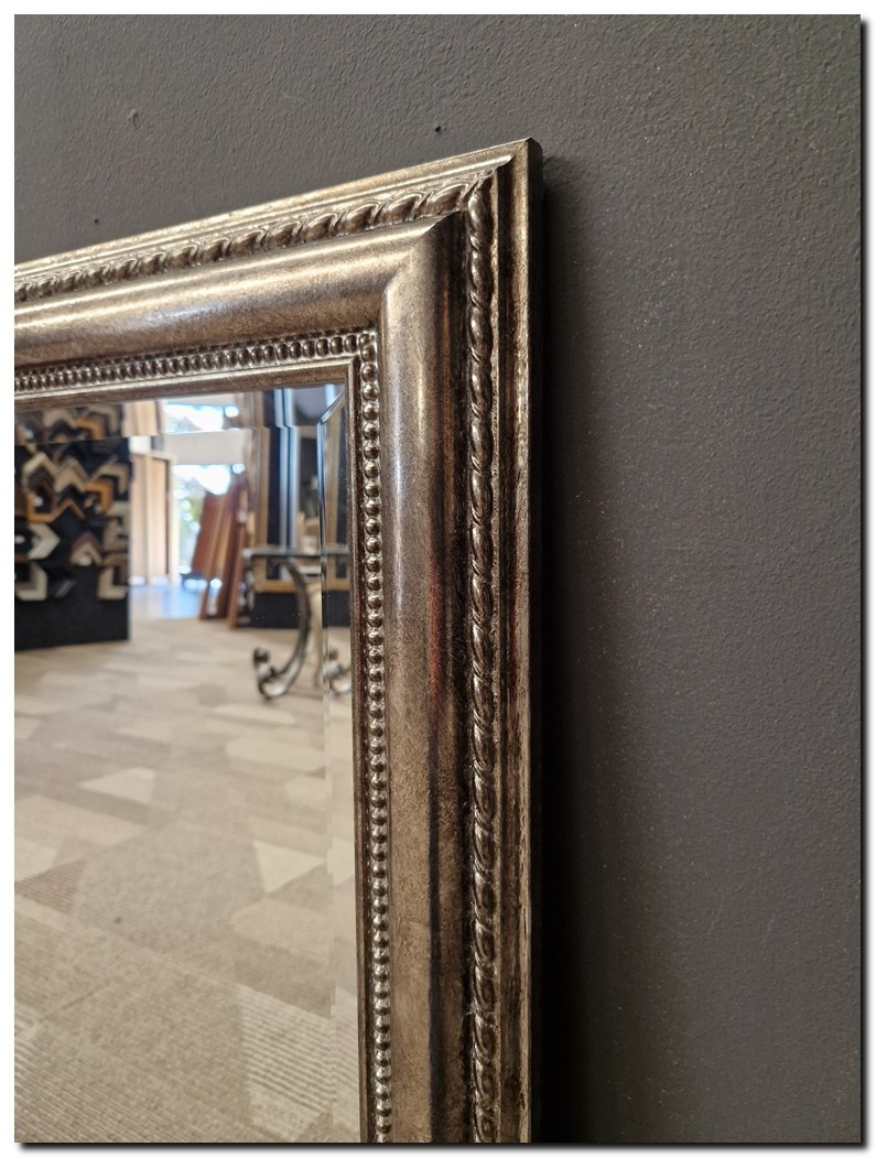 Op het materiaal gebruik is zeker niet bezuinigd, de lijst is gemaakt van hout en het kleuren gebeurd met  bladzilver slagmetaal, daarna word de spiegellijst gepatineerd voor de antiek look.