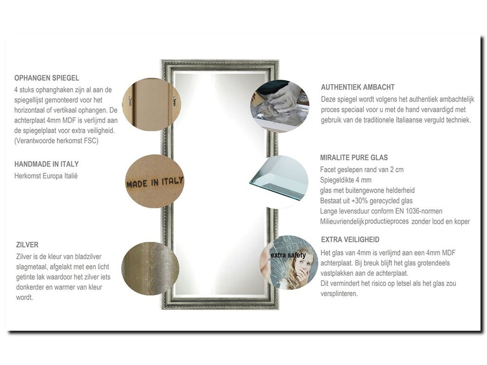 Om te beginnen wordt iedere spiegellijst ambachtelijk gemaakt en gekleurd door ambachtslieden in Italië, zo heeft u een ruime keus in de kleuren maar ook in de details hiervan.