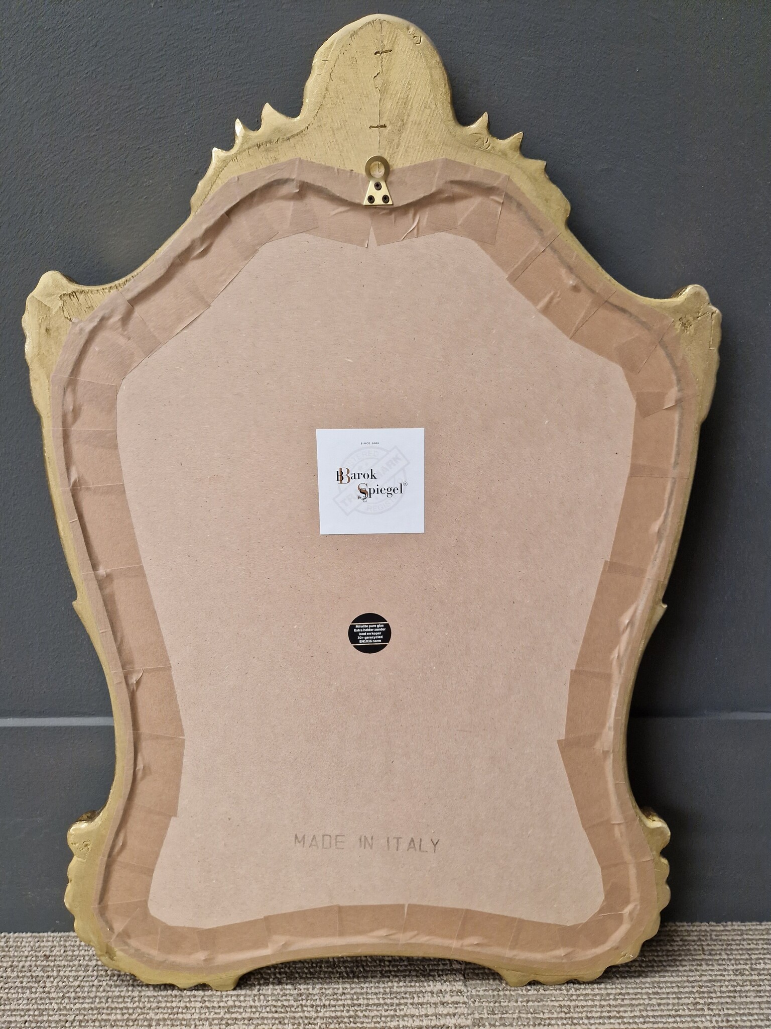 Deze spiegel wordt volgens het authentiek ambachtelijk proces speciaal voor u met de hand vervaardigd met gebruik van de traditionele Italiaanse verguld techniek met bladzilver of bladgoud slagmetaal.