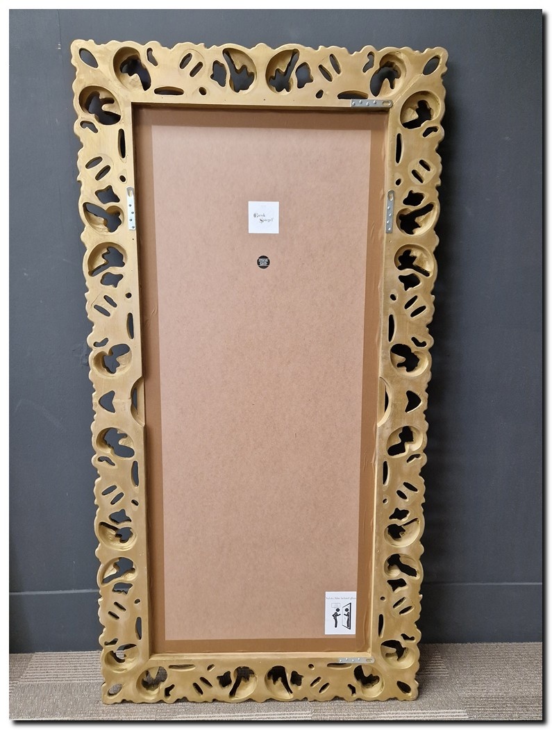 Doordat het kader is opengewerkt wordt de spiegellijst één met de muur waartegen de spiegel geplaatst wordt.