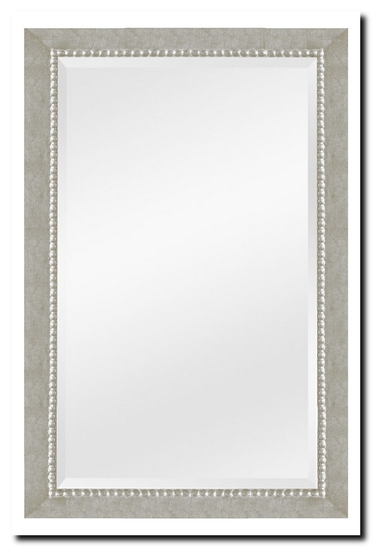 De spiegel heeft een smalle rand en een subtiele parel ketting.