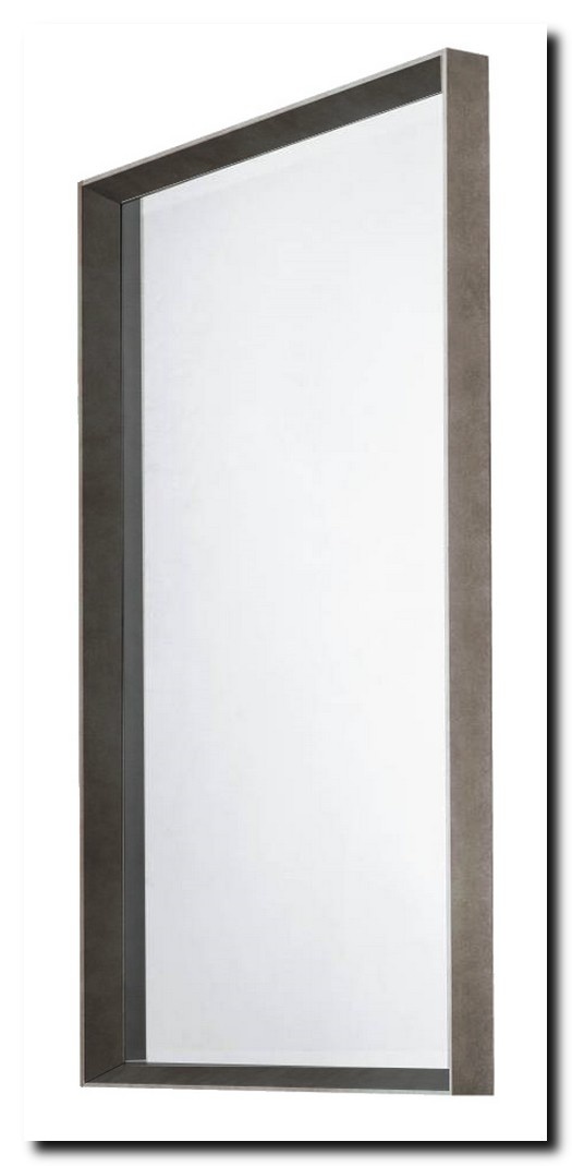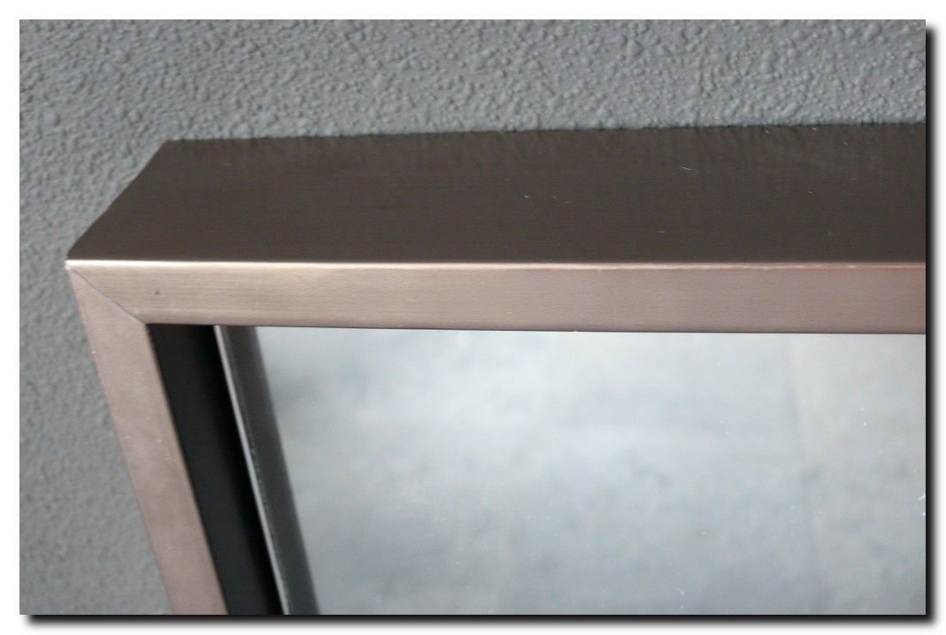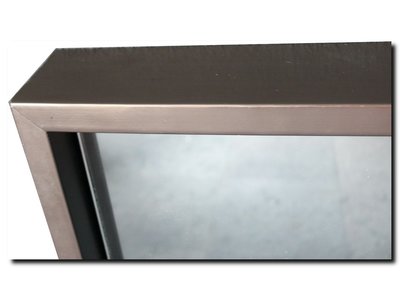 Super strakke, moderne verdiepte spiegel met een industrieel used look in tin kleur.